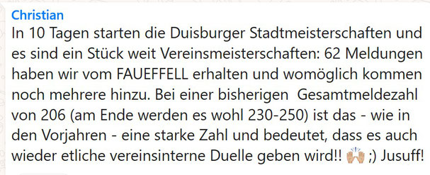 Wir beginnen mit der Sammlung eurer Meldungen für die Duisburger Tischtennis Stadtmeisterschaften!